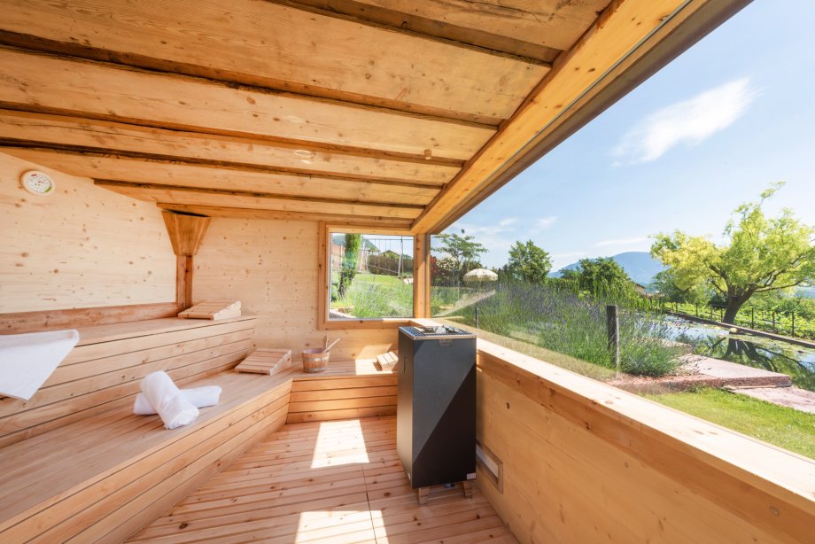 - Terrasse, Garten und/oder Balkon mit Tisch und Stühlen, Liegestühle und Sonnenschirm